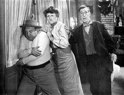 We added the film "4 for Texas" (1963), starring Frank Sinatra and Dean Martin, among others. Larry, Moe and Curly-Joe play three inept painting deliverymen, recreating with Martin the old gag of "point to the right". They then relive the old "he's one of the toughest men of * clap-clap-clap * Texas!" routine with other actresses.