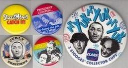We received 5 various badges: a 1-inch Rasta badge (manufacturer and date unknown), a 1½-inch "CURLY for PRESIDENT" button (1983, Norman Maurer Productions), a 2-inch anti-Clinton button from the '90s, a 2-inch from the movie "Stoogemania" (1985, Atlantic) and a large 3-inch pin from Clark Collector Cups (1993, Norman Maurer Productions).