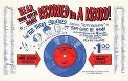 Se suma a la colección este raro panfleto publicitario de 1959 para promocionar los discos de "Feliz Cumpleaños" de los Tres Chiflados. Condición: MINT. La idea del disco de por sí merece un capítulo aparte: en un intento por personalizarlos, los Chiflados grabaron el Feliz Cumpleaños a 238 nombres diferentes! (120 de niñas, 102 de niños y 16 nombres genéricos). Cada uno de estos discos venía en una cubierta amarilla que también estaba personalizada con deseos de feliz cumpleaños para cada nombre. También se editaron otros dos tipos de cubiertas. Al parecer la comercialización del disco de "Feliz Cumpleaños" fue un fracaso porque los vendedores minoristas no pudieron tener todos los nombres disponibles.